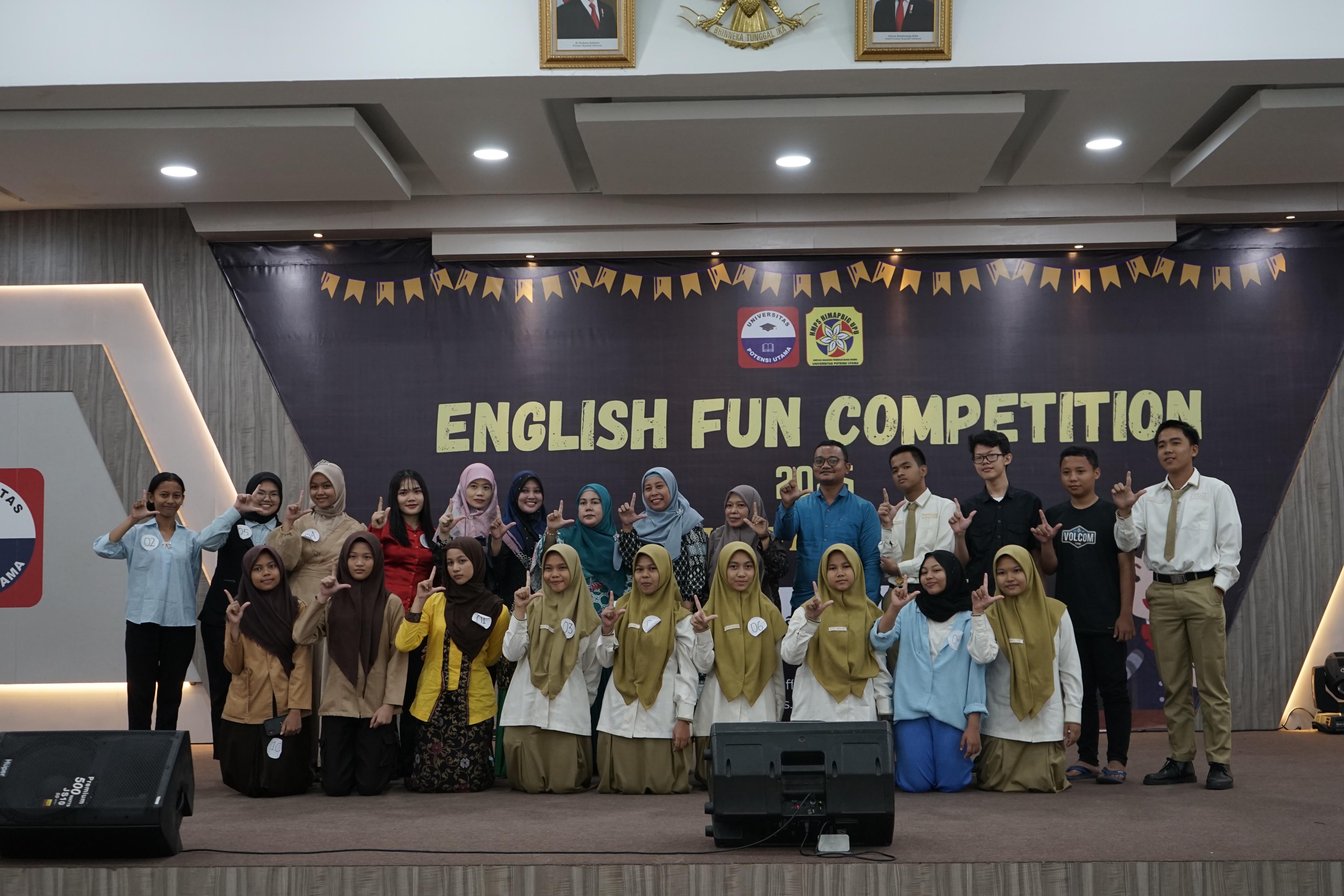 Himpunan Mahasiswa Pendidikan Bahasa Inggris Universitas Potensi Utama sukses menyelenggarakan English Fun Competition 2025 pada Sabtu, 24 Mei 2025, di Auditorium Gedung B, Universitas Potensi Utama. Kegiatan yang berlangsung dari pukul 08.00 hingga 16.00 WIB ini bertujuan untuk meningkatkan minat dan kemampuan berbahasa Inggris secara aktif, kreatif, dan kompetitif di kalangan mahasiswa serta pelajar.